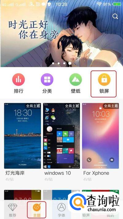 进入之后,点击页面底部的“主题”,可以看到上方有“锁屏”选项,点击一下。