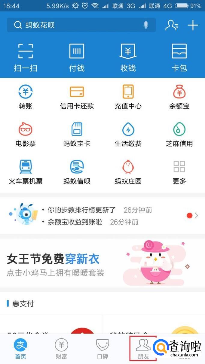 首先,我们打开支付宝客户端主页面,在主页面中,点击页面底部“朋友”选项。