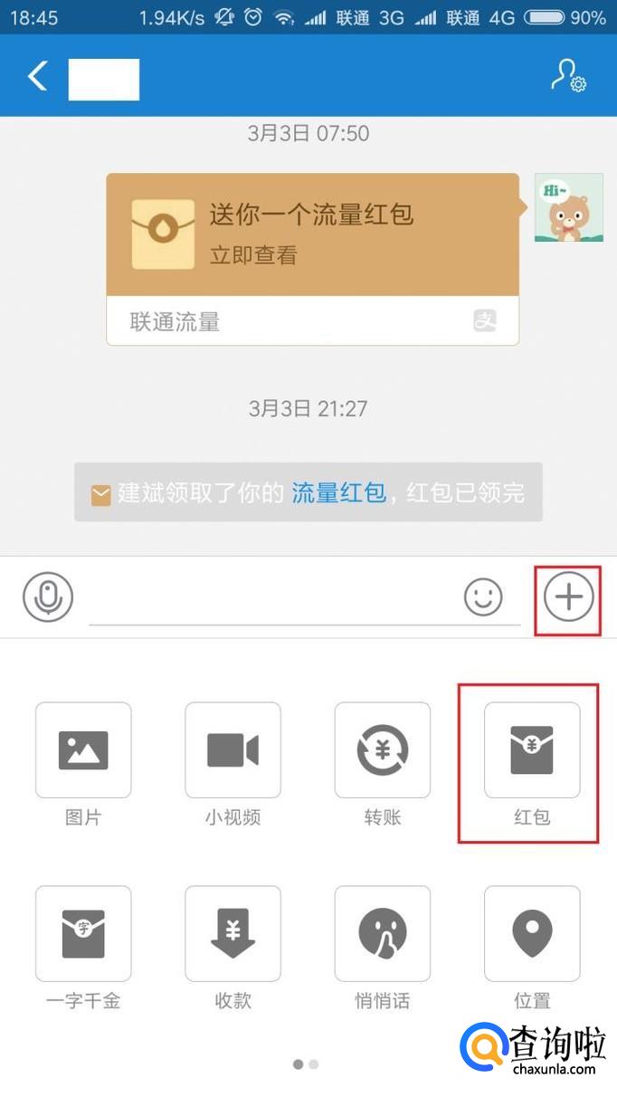 打开好友聊天页面之后,在聊天窗口中,点击“+”按钮,选择“红包”选项。