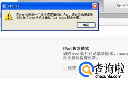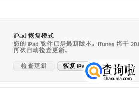 当看到屏幕黑屏时,请松开电源键,继续按住主屏 home 键,直到电脑端的 itunes 出现检测到一个处于恢复模式的 ipad,点击 itunes 窗口里的“恢复 ipad”按钮;