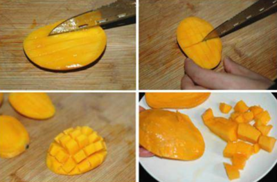 取一个水果刀把芒果从偏一点的地方切成两半,在芒果果肉上划“十”字的样子,然后用手把果皮向外翻动,用刀刮下来即可食用。芒果也可以用来榨汁,或者加入一些沙拉酱,制成自己风味诱人的沙拉食用,还可以和牛奶搭配做成芒果牛奶沙冰。另外芒果晒干以后做成芒果干也是比较好吃的。