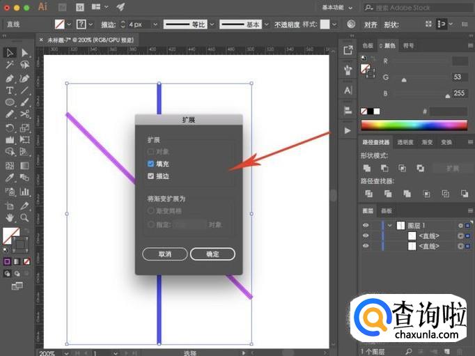 在扩展弹框中勾选“填充、描边”,点击“确定”即可进行扩展。