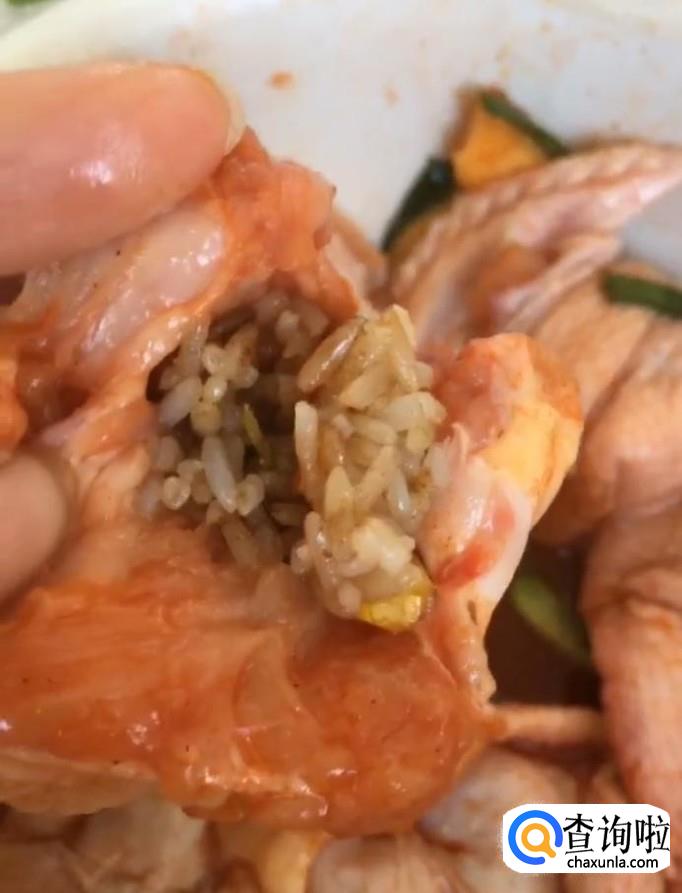 然后我们把放凉的蛋炒饭塞入鸡翅中,装八分满即可