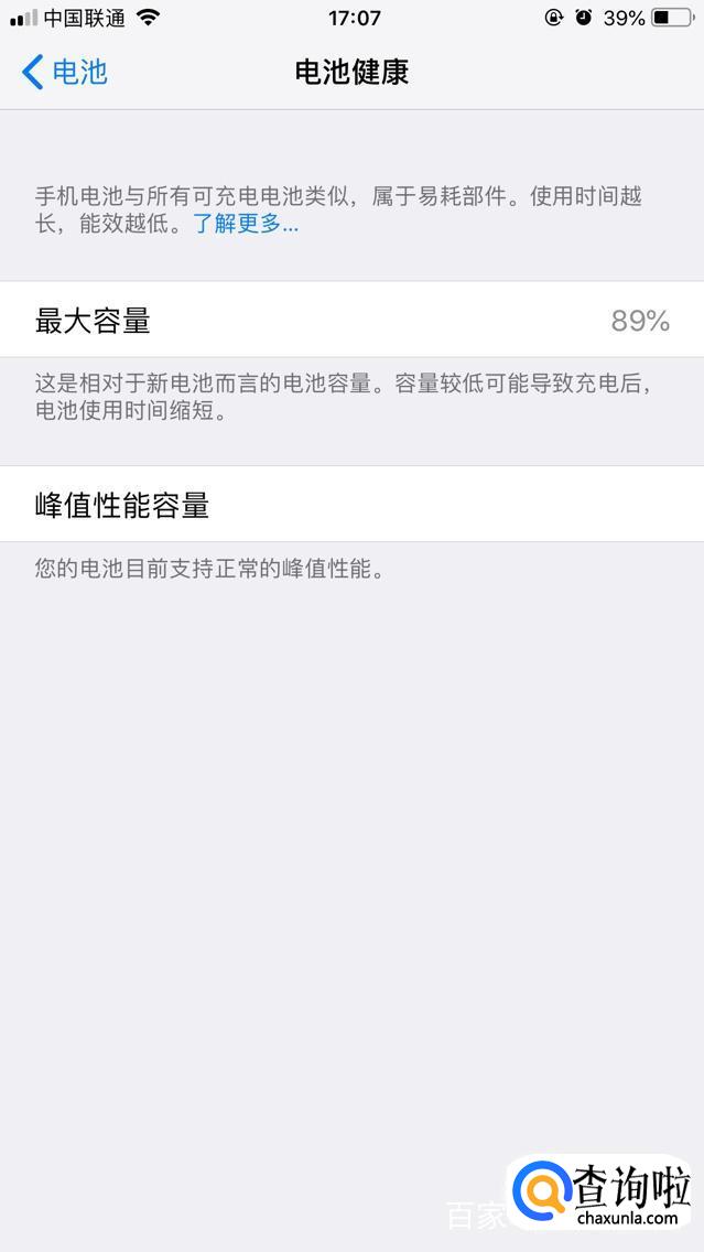 然后我们可以查看一下手机的电池健康,如图,设置--电池查看我们的电池使用情况,一般来说,新买来的手机电池的最大容量是100,如果手机的电池容量严重低于这个值,说明手机的电池使用很不健康,这也会影响手机的运行速度。