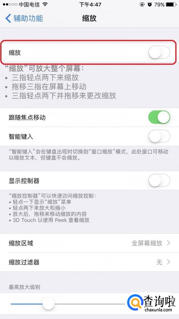 如果上述这些方法都没用,我们还可以尝试关闭一些手机的辅助功能。如图所示,设置--通用--辅助功能,我们可以选择把缩放功能关闭,然后再把辅助功能里的辅助快捷键关闭,这样手机的运行速度就会提升很多了。