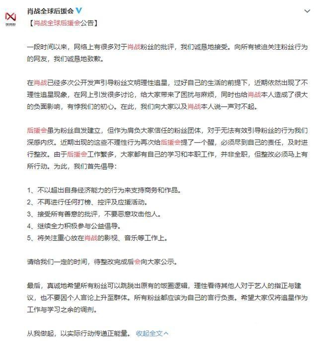随着肖战的道歉,社会舆论明显减少,而肖战全球后援会更是响应肖战的号召,于5月15日晚发文开始整改,特意提倡五点要求:
