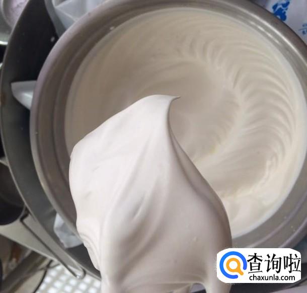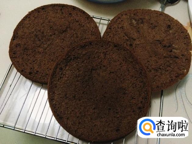蛋糕在烤箱的时间,可以把淡奶油加糖打发。然后取出蛋糕后平均切成三片。