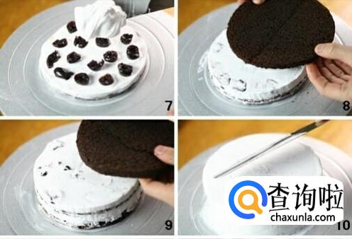 在每层蛋糕上用毛刷刷上樱桃酒,然后抹上打发的淡奶油,淡奶油上也可以撒上一些樱桃碎或其它新鲜水果。一层蛋糕一层奶油。最后使其奶油覆盖整个蛋糕。