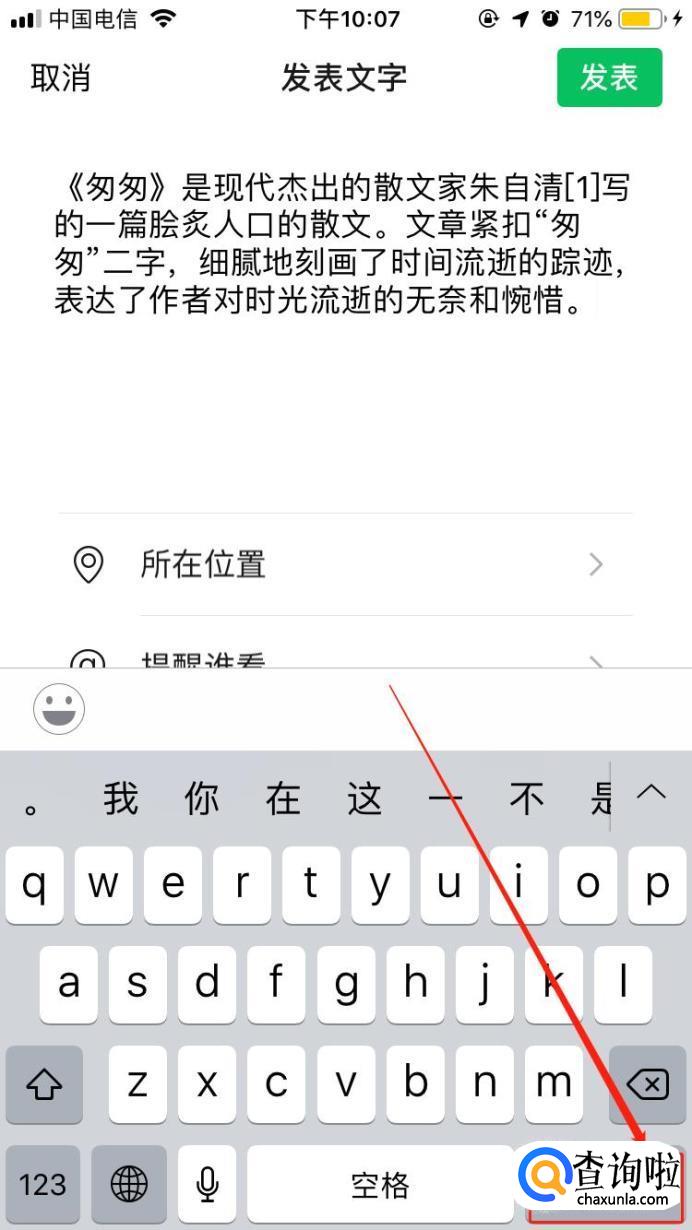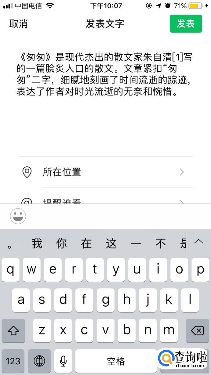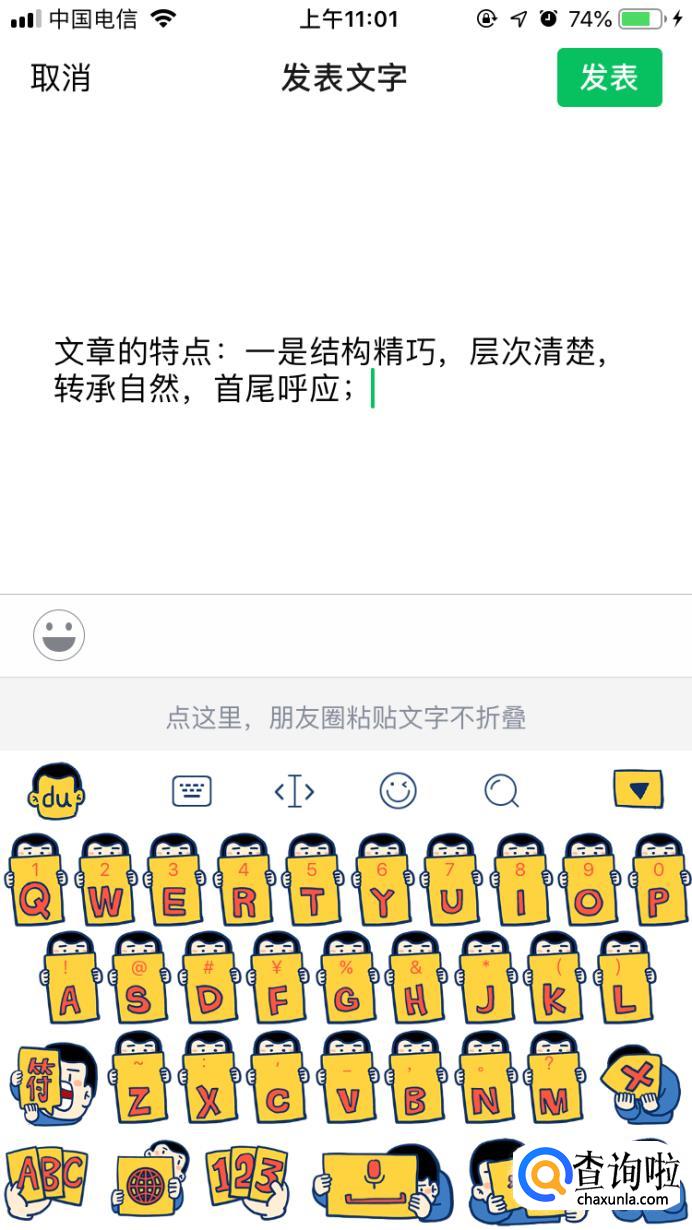 结束后,我们可继续在输入文字,而且输入的第二部分的内容,无限制(这部分内容就会隐藏在“全文”下面)。完成所以操作点击右上角发送即可。