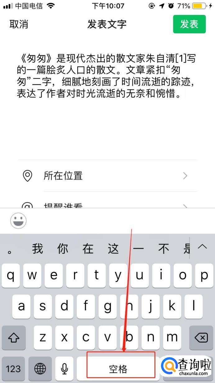 换行成功以后,接着就点击空格符号(输入键盘最后一排一长条的符号)。