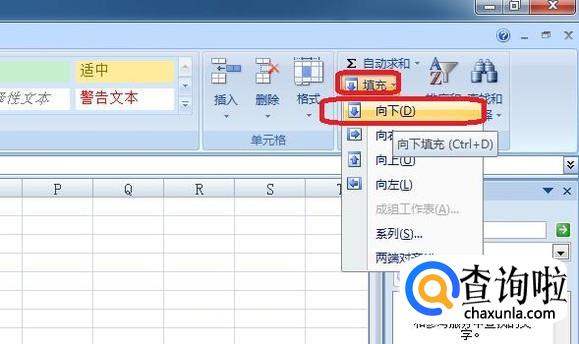 我们点击菜单栏“开始”选项卡下,功能区中的“填充”,选择“向下填充”。