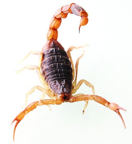 蝎子是动物界节肢动物门蛛形纲蝎目种类的统称,蜘蛛亦同属蛛形纲。它们典型的特征包括瘦长的身体、螯、弯曲分段且带有毒刺的尾巴(后腹部)。