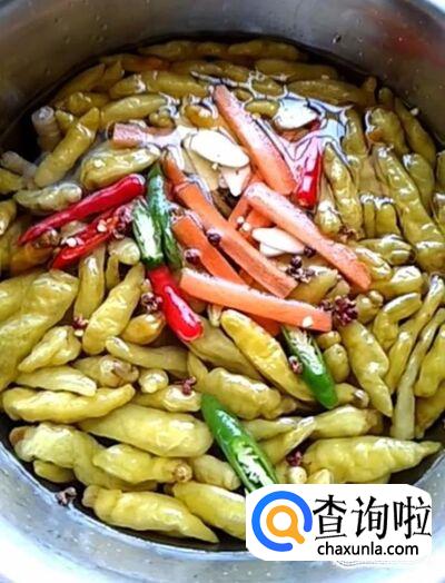 然后我们在盆中倒入一袋泡椒,加入适量的白醋,盐,鸡精,白糖,搅拌均匀