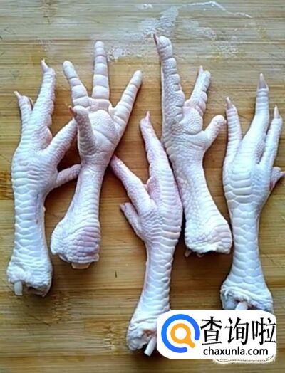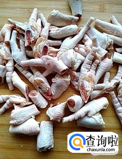 首先我们准备一下鸡爪,清洗干净,把它的指甲切掉,用刀剁成块备用