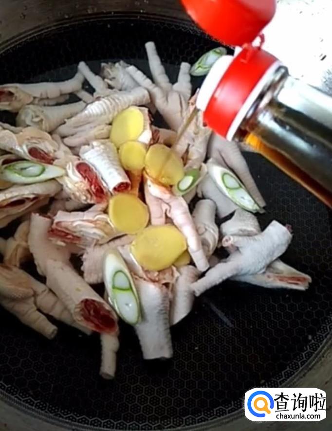 接着我们把鸡爪放入锅中,加入适量的葱姜片,倒入适量的料酒,煮10分钟