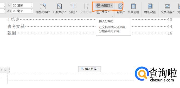 退出页眉页脚的编辑状态,将鼠标移到目录页的分页符的后方,点击【页面布局】,在选项栏中选择【分隔符】。