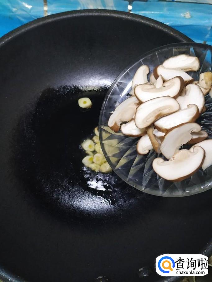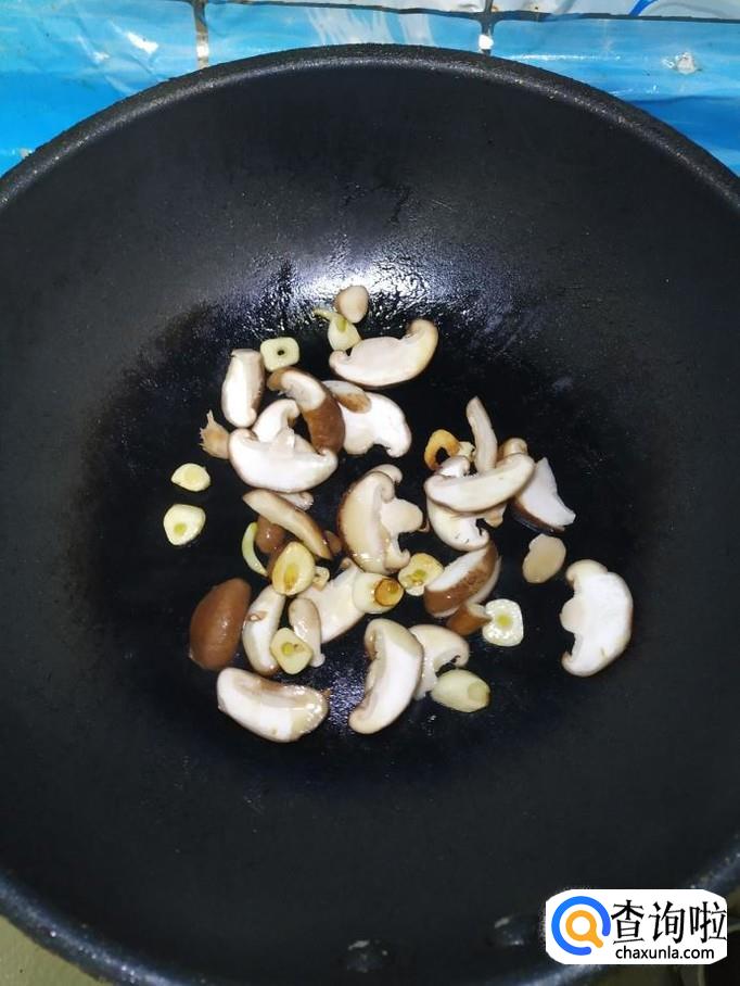 准备适量大蒜,去除外衣后,切成片备用,炒锅中放入适量油,油热后,放入蒜片炒香,然后将香菇片,倒入锅中,翻炒均匀,炒至香菇片变软就差不多了。