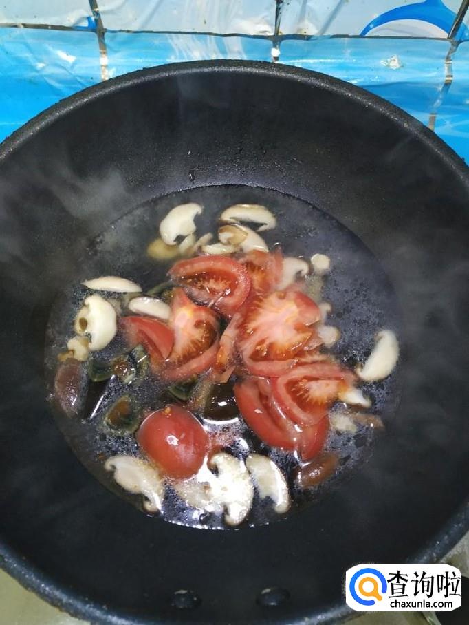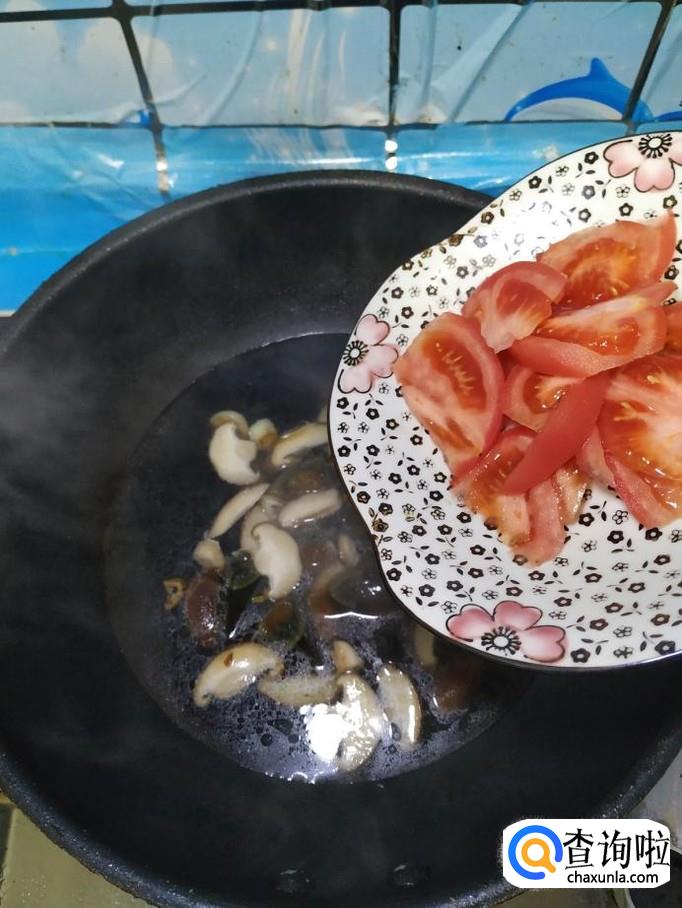 准备适量新鲜的香菇,洗净后,切成片,放入盘中备用,再准备适量西红柿,洗净后,切片备用。