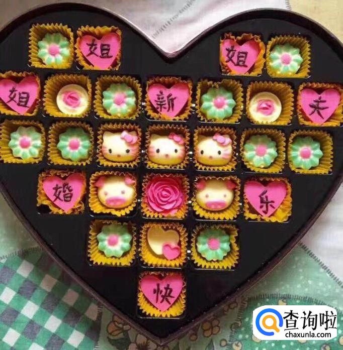 摆盘:其他的猪猪,玫瑰都可以按照KITTY这么来设计制作,最后就是摆盘了,需要准备一个巧克力礼品盒,可以按照我这种方式来摆盘也可以你自己设计都可以。