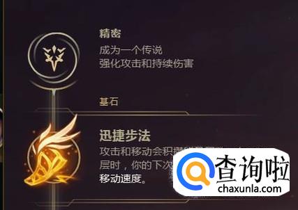 女警这个英雄是纯后期的英雄,装备三件套之后才有一定的伤害,所以前期一定在线上稳住,那么要选的基石可以点迅捷步伐,增加赖线能力