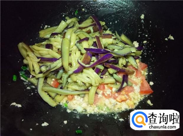 炒出番茄汁后,再加入炒软的茄子丝,再一起翻炒均匀,番茄会吸收一些茄子的油,这是整道菜的关键。