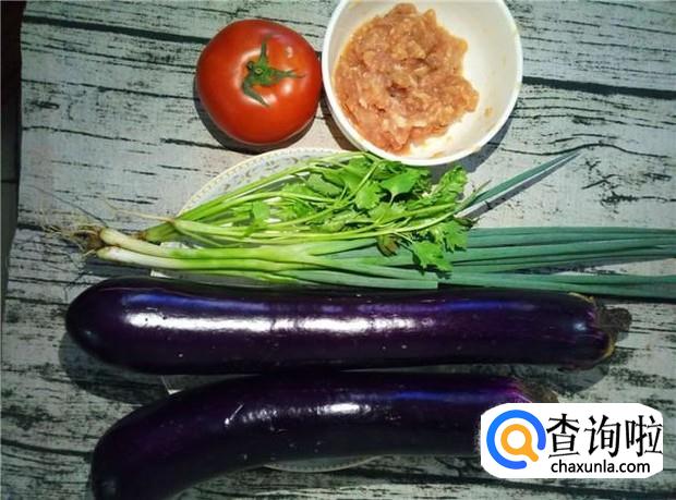 准备好所有原材料:茄子两根、番茄一个、半肥瘦适量、香菜和葱适量。这个分量完全足够两个人吃的了。