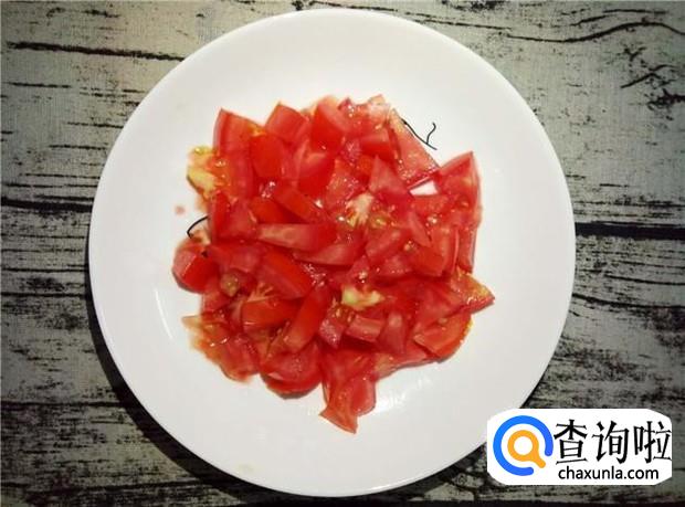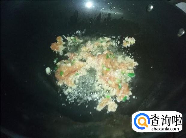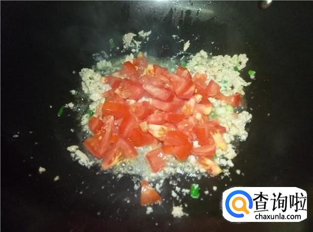 然后把肉沫倒下去翻炒几下,再加入番茄丁,小火,把番茄丁炒出番茄汁。