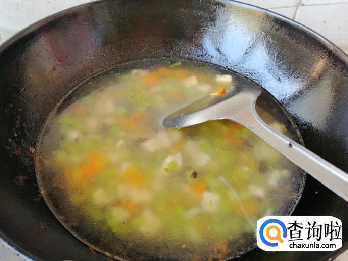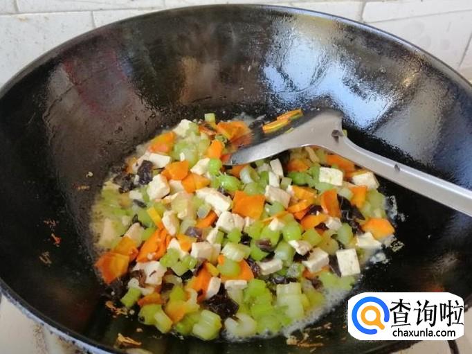 下面我们就准备炒菜调汤,炒锅放油,油热后依次放入备好的胡萝卜、芹菜、木耳、豆腐,用铲子翻炒均匀,加入适量盐,炒熟这些菜后,盛出来一些。