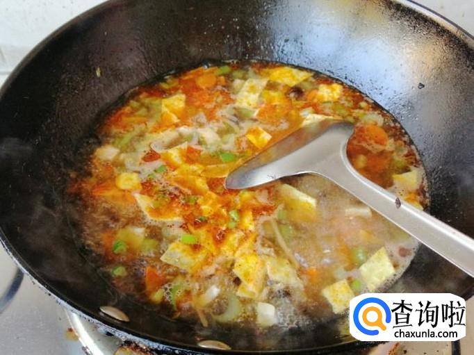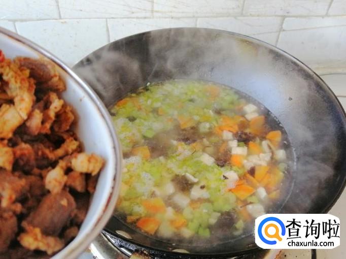 锅中留一半炒熟的菜,加入适量清水或热水,煮开后先加入适量臊子肉,煮开锅让肉和菜在锅中翻滚。