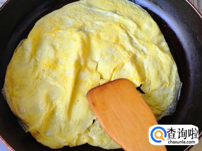选用两个新鲜的鸡蛋,用清水洗净,磕入碗中,用筷子把鸡蛋打散,煎过刷油,把蛋液煎成鸡蛋饼,然后把鸡蛋饼切成菱形块待用。