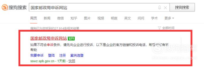 在搜狗搜索引擎上搜索“国家邮政局申诉网站”,在搜索结果中点击进入其官网。