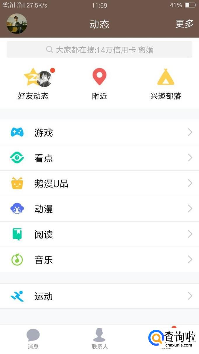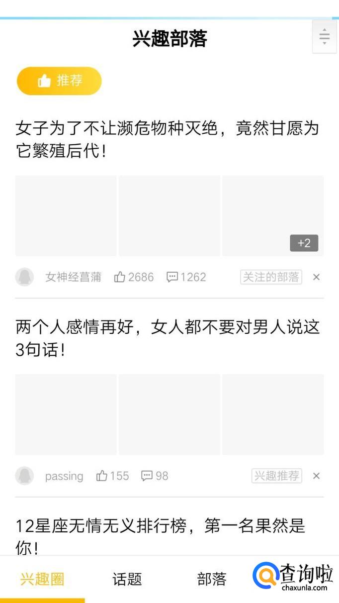首先进入QQ“动态”界面,然后点击靠右边“兴趣部落”入口,也就是黄色的三角形按钮。