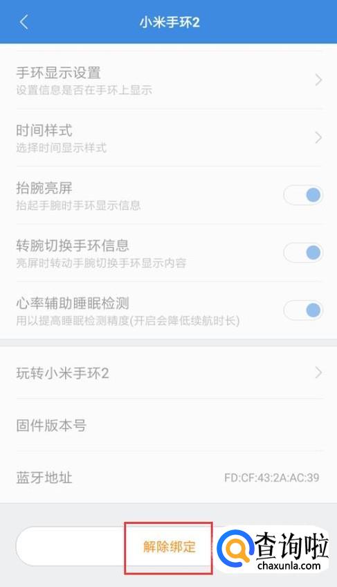 在“小米手环2”界面翻到最底端,找到“解除绑定”按钮。