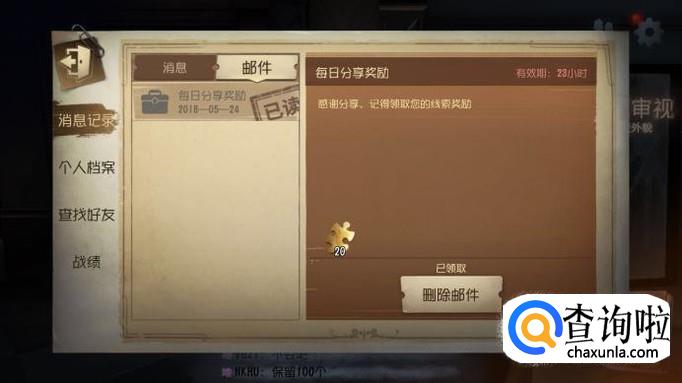 另一个获取方法是每天分享一下游戏到微信,就能够获取20线索点,可在邮件中领取。