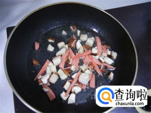 将香菇丁、火腿丁和青豆放进油锅里炒一炒,然后根据自己口味调味,并且添加适当的清水烧开,烧开后将卤汁倒进电饭锅里,和糯米搅拌均匀。