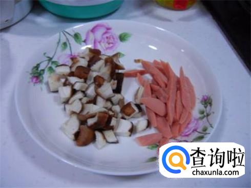 香菇清洗干净,切成丁,火腿切成丁,新鲜青豆适当,将这些食材都准备好待用。