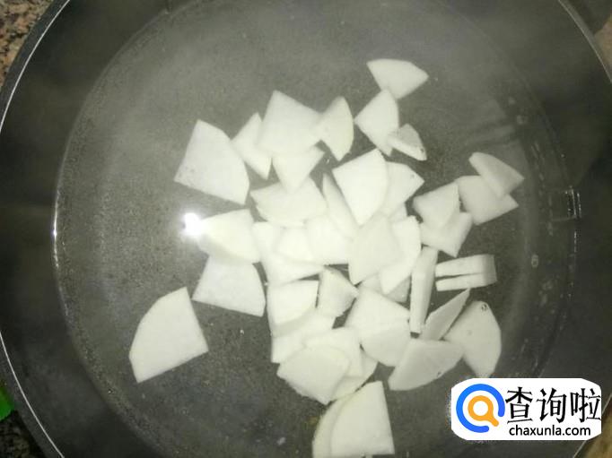 取半根白萝卜,将白萝卜削皮,清洗干净,切成薄片状;白萝卜买的时候要注意看是否新鲜,不新鲜的萝卜经常会有空心、无水分的情况,就不好吃了;