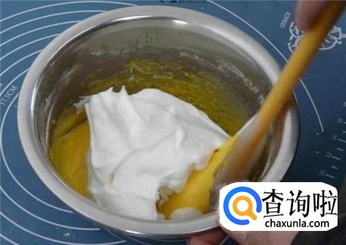 用刮刀把打发好的蛋白一点点加入到蛋黄中,让蛋白和蛋黄融合均匀。