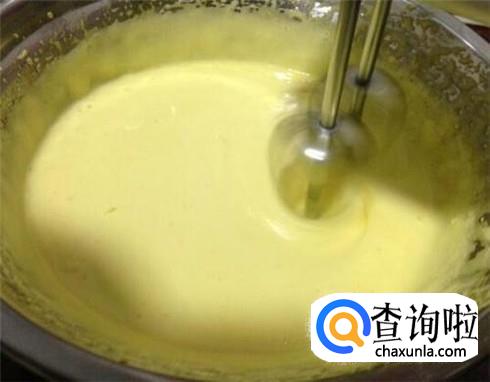 然后开始打发蛋黄。在蛋黄中加入适量的食用油、面粉、牛奶、白糖,用勺子上下打发蛋黄,把蛋黄打发均匀即可。