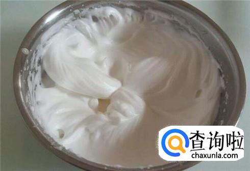 将6个鸡蛋的蛋清和蛋黄分开,在蛋清中加入三勺白糖,再用打蛋器打发蛋清,打发成奶油状。