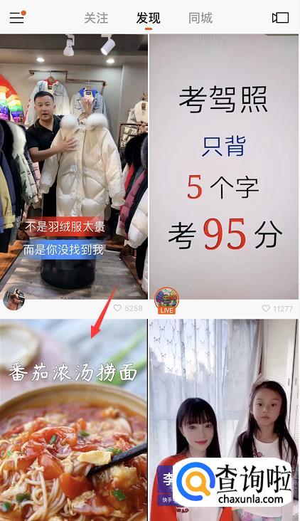 快手转发别人视频的作品和抖音还是有区别的,首先我们打开快手首页,点击打开一个短视频。