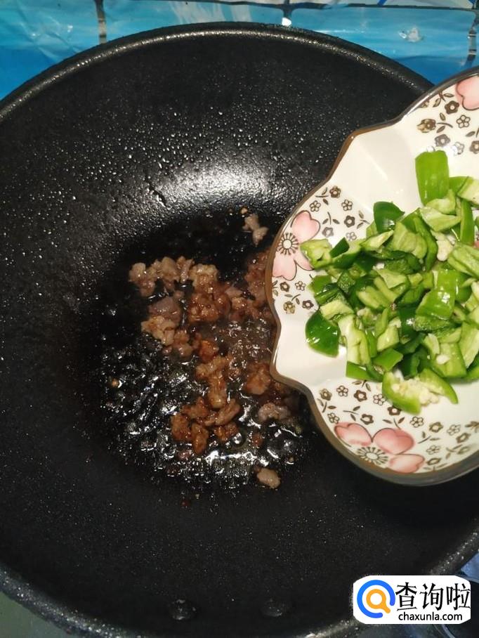 将准备好的青椒丁放入锅中,搅拌均匀,炒至青椒丁儿变软就可以了。