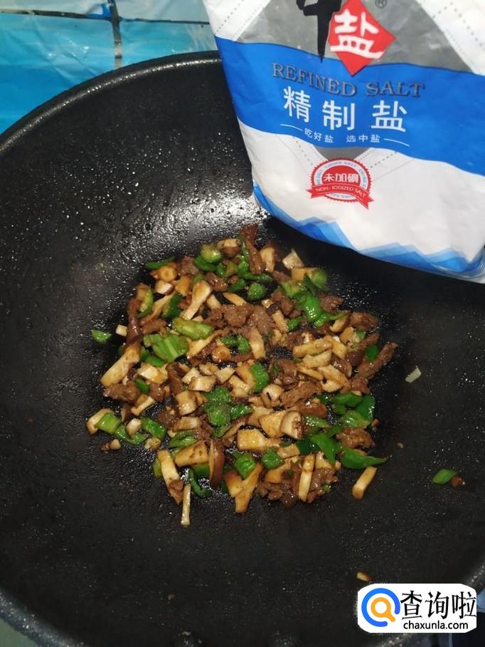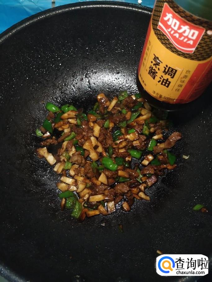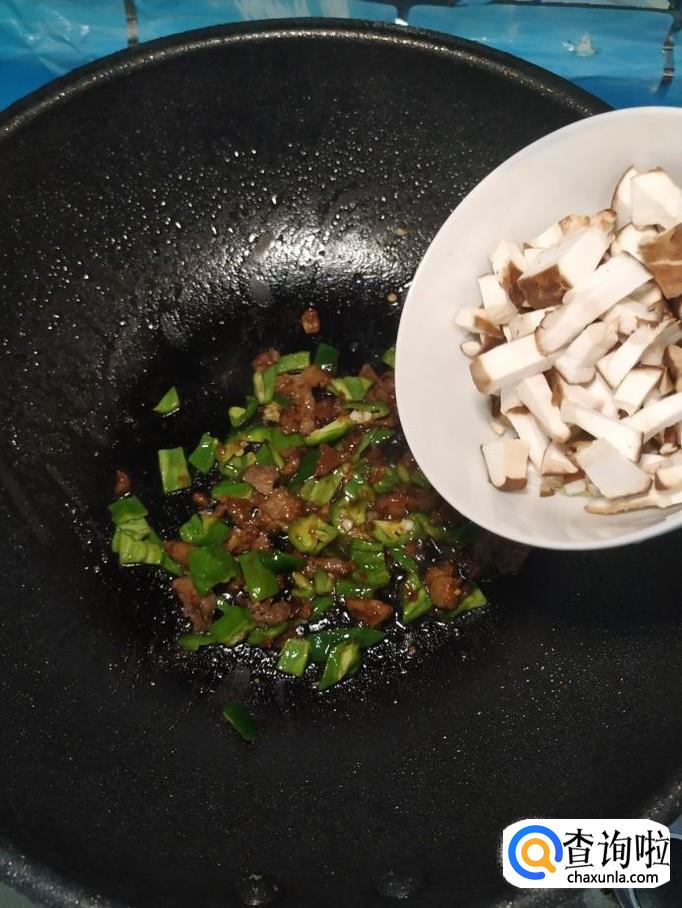 将准备好的香菇丁儿倒入锅中,和青椒一起翻炒均匀。