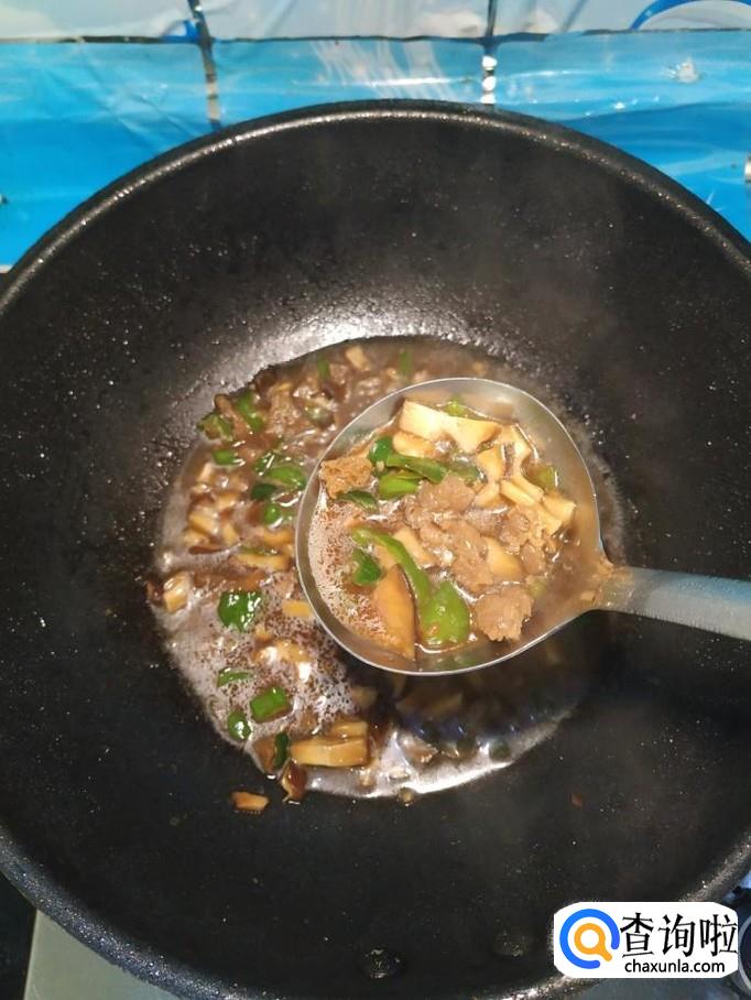 加入小半碗清水,大火将水烧开,煮三分钟左右,然后再用少许水淀粉勾芡一下,熬至汤汁浓稠,香菇牛肉酱就做好了。