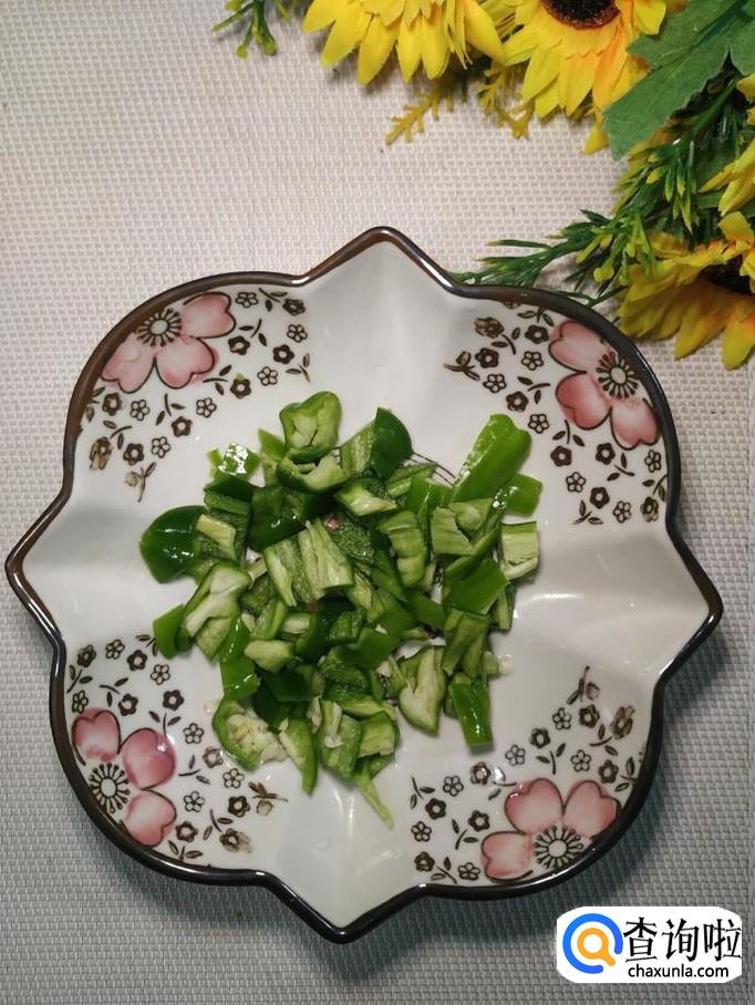 准备适量青椒,洗净后切成丁,再准备两个新鲜的香菇,洗净后也切成丁备用。