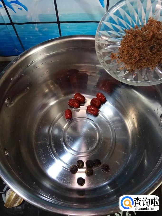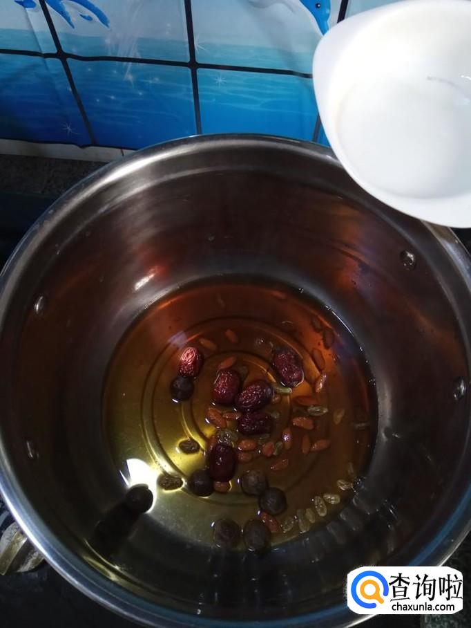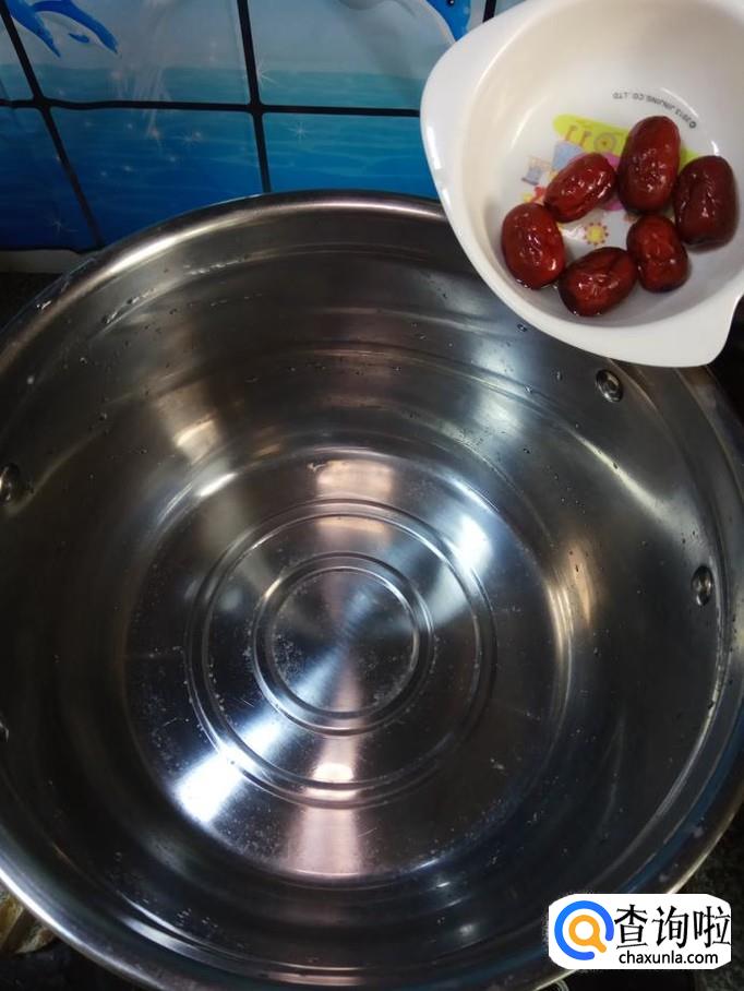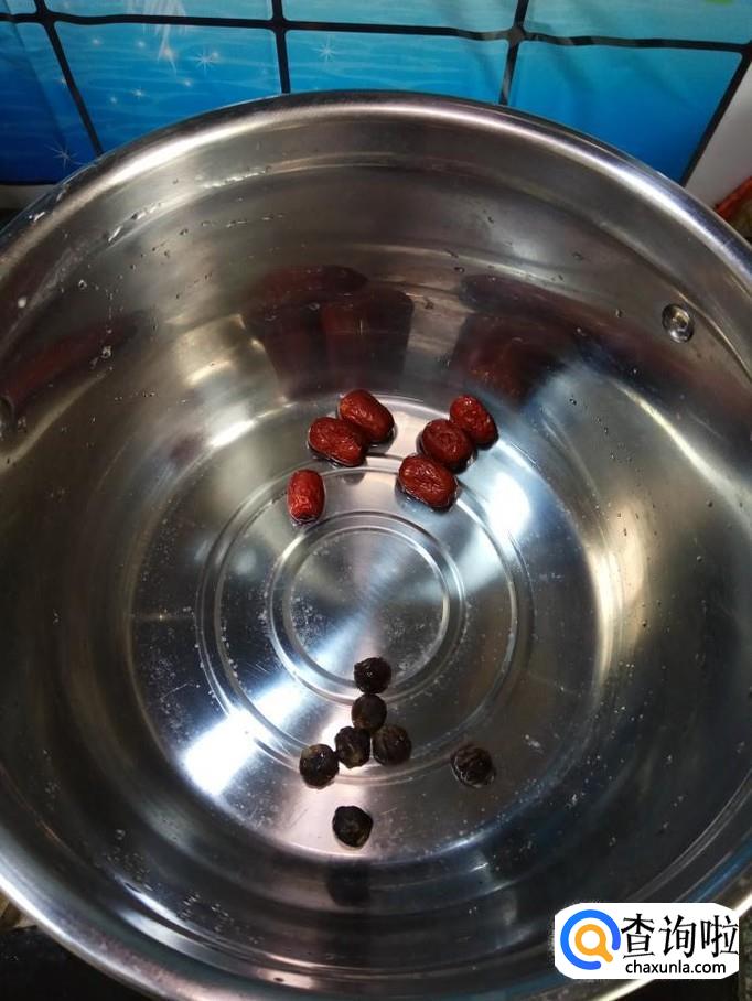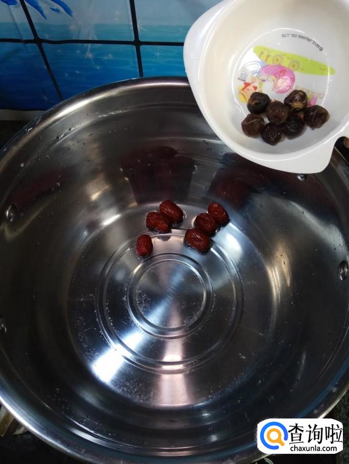 将泡好的大枣和桂圆放入锅中,这两个食材都有温补的功效。