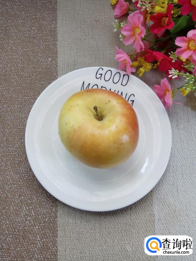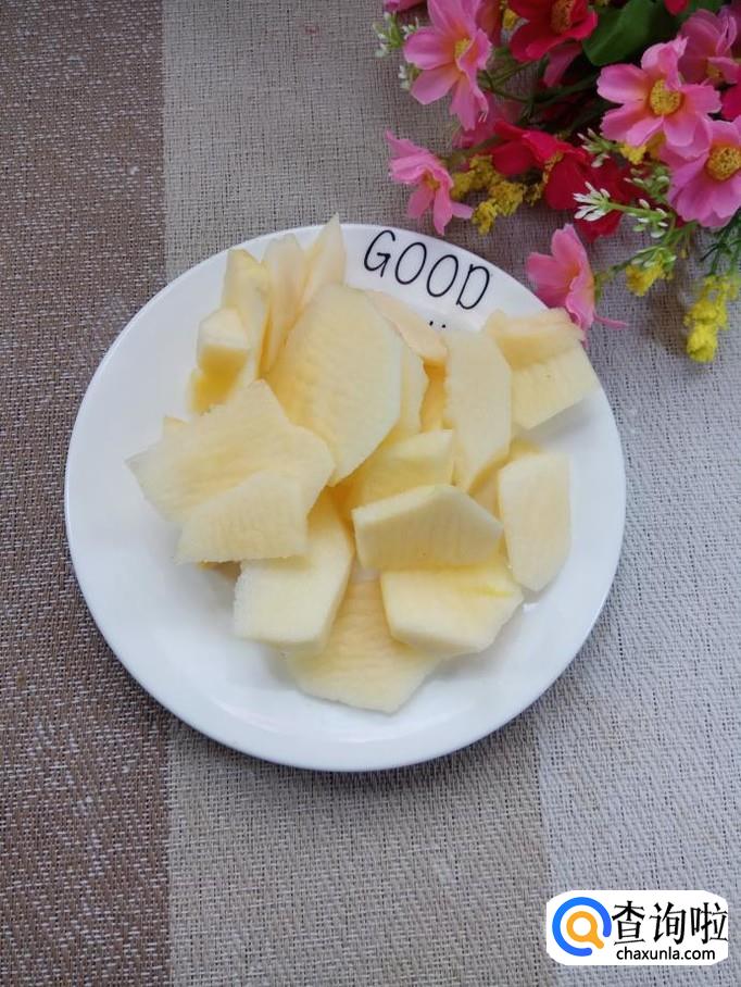 准备一个红富士苹果,洗净后,去除外皮,切成滚刀块,放入盘中备用。注意,苹果一定要选用新鲜偏甜的苹果,这样做出来的粥才更好喝。