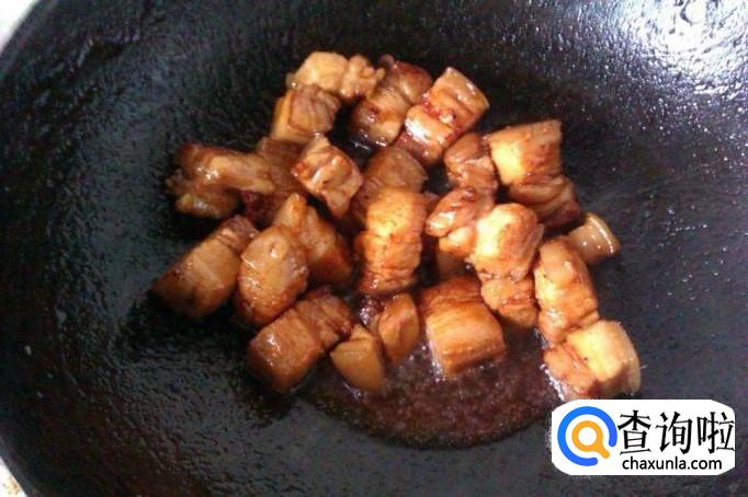 然后把煮好的五花肉切成小块后放入锅里面用糖上色,这样子的五花肉味道会比较好吃。
