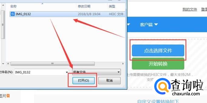 页面跳转后,直接点击“点击选择文件”在弹出的窗体中找到需要转换的heic格式文件添加并打开
