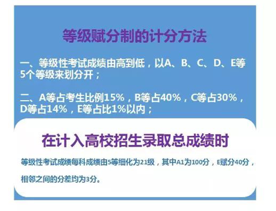 是按照分数排名的百分比而非卷面分数来计算成绩的一种方法,只用于选考科目的成绩统计。考生各科成绩,以当次高中学考合格成绩为赋分前提,高中学考不合格不赋分,起点赋分40分,满分100分,共分21个等级,每个等级分差为3分。以各科“必考题70分+加试题30分”卷面得分为依据,按最接近的累计比例划定等级。